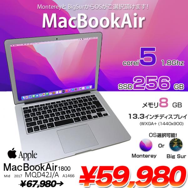【中古パソコン】Apple MacBook Air 13.3inch MQD42J/A A1466 Mid2017 [core i5 5350U 1.8GHz メモリ8G SSD256GB 無線 BT カメラ 13.3インチ Monterey 12.0.1 ] :アウトレット