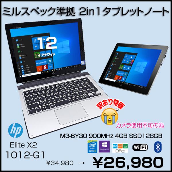 【中古パソコン】HP Elite x2 1012 G1 中古 2in1タブレット Office Win10 キーボード付[Core M3 6Y30 メモリ4GB SSD128GB 無線 GPS 12型]:訳あり品