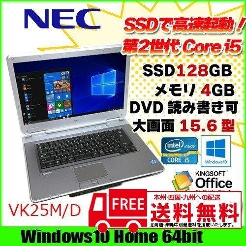 【中古パソコン】NEC VK25M/D 中古 ノートパソコン Office Win10 Home 第2世代 高速SSD塔載 [corei5 2520M 2.5GHz 4G SSD128GB マルチ 無線 15.6型 A4 ] :良品
