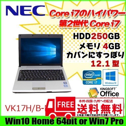 【中古パソコン】NEC VK17H/B-D 中古 ノート Office Win10 or 7選択可 第2世代 モバイル [corei7 2637M 1.7GHz 4G HDD250GB 無線 12.1型ワイド B5 ] :良品