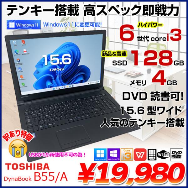 【中古パソコン】東芝 dynabook B55/A 中古 ノート Office 選べる Win11 or Win10 第6世代[Core i3 6100U 4GB SSD128GB マルチ 無線 テンキー 15.6型] :訳あり品