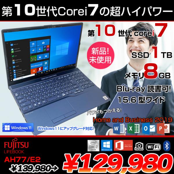 富士通 LIFEBOOK AH77/E2 新品未使用 ノート Office Win10 home テンキー カメラ Windows11対応[Core i7 10510U 8GB SSD1TB Blu-ray 無線 15.6型 ブルー]:新品