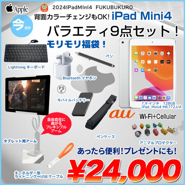 【中古iPad iPadMini4 便利に使える付属品付もりもり9点福袋 】Apple iPad mini4 MK772J/A A1550 au Wi-Fi+Cel 128GB カラー iPad OS 15.8 シルバー]:アウトレット