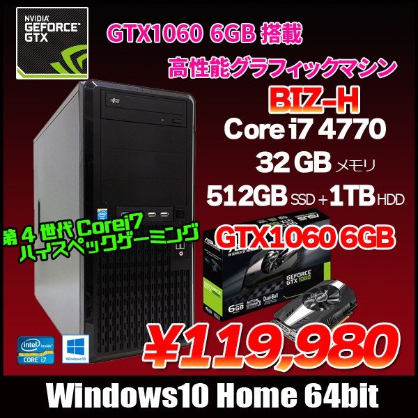 【中古パソコン】BIZ-H 最強ハイブリッド ゲーミングパソコン GTX1060 6GB搭載 [core i7 4770 3.4GHz メモリ32G HDD1TB+SSD512GB マルチ 電源1250W]