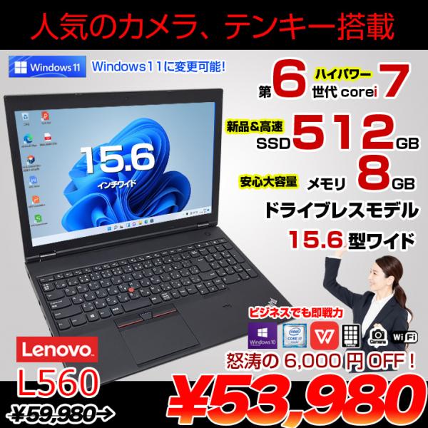 【中古パソコン】Lenovo L560 中古 ノート Office Win10 or Win11 第6世代 [Core i7 600U 8G SSD512GB 無線 テンキー カメラ 15.6型] :良品