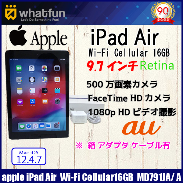 【中古iPad】Apple iPadAir Retina au Wi-Fi Cellular 16GB MD791JA/A [Apple A7 16GB(SSD) 9.7インチ OS 12.4.7 スペースグレイ ] :良品