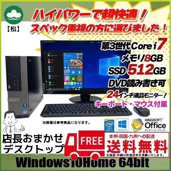 店長おまかせデスクトップパソコン【松】Office Win10 Home 64bit 24インチ液晶 キーボード マウス付 [高速Core i7 メモリ 8G SSD512GB マルチ ]