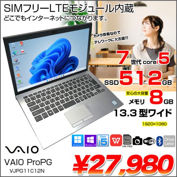 【中古パソコン】VAIO ProPG VJPG11C12N SIMフリー 中古 ノート Office Win10or11 フルHD 第7世代 [Corei5 7200U 8GB SSD512GB 無線 カメラ BT 13.3 シルバー]:アウトレット