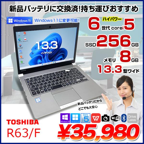 【中古パソコン】東芝 dynabook R63/F 中古 ノートパソコン 新品バッテリに交換済で持ち運び安心 Office 選べる Win11 or Win10 第6世代 カメラ [Core i5 6200U 2.3GHz 8GB 256GB 無線 13.3型 HDMI SD] :良品