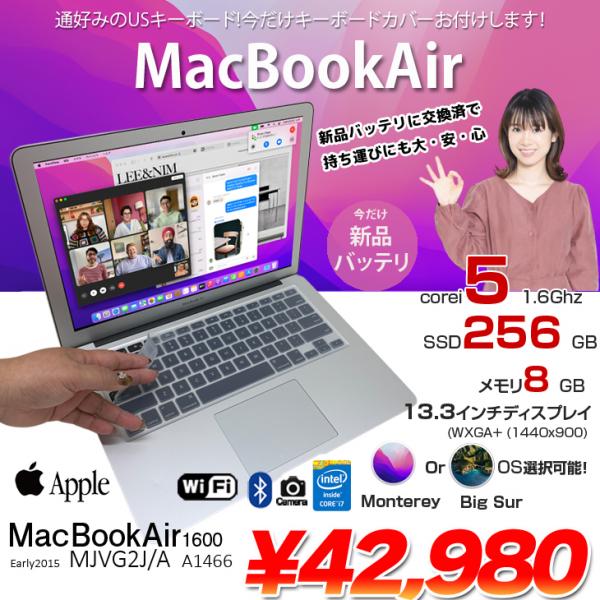 【中古パソコン】【今だけ新品バッテリ交換・キーボードカバープレゼント】Apple MacBook Air 13.3inch MJVG2J/A A1466 USキー Early2015 選べるOS Monterey or Bigsur [core i5 5250U 8G SSD256GB 無線 BT カメラ 13.3] :良品