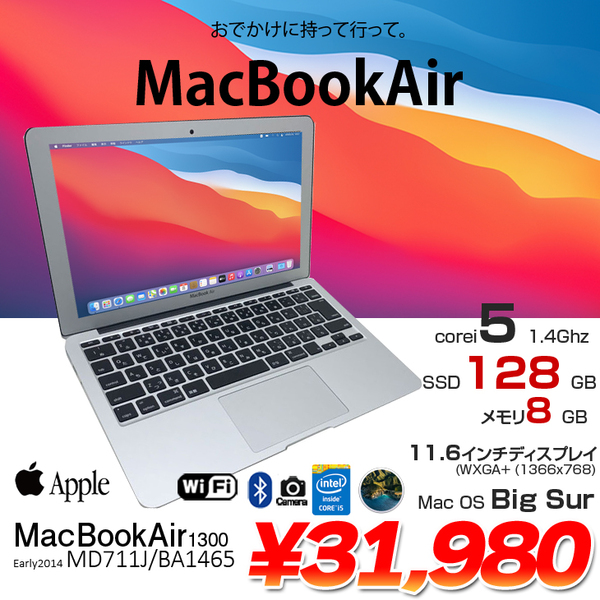 【中古パソコン】Apple MacBook Air 11.6inch MD711J/B A1465 Early2014 [core i5 4260U 1.4GHz メモリ8G SSD128GB 無線 BT カメラ 11.6インチ BigSur11.6] :アウトレット