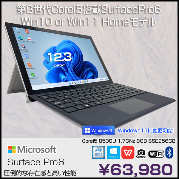 【中古パソコン】Microsoft Surface Pro6 中古 タブレット office Win10 orWin11 Home [Core i5 8350U 8GB 256GB カメラ タイプカバー ]:良品