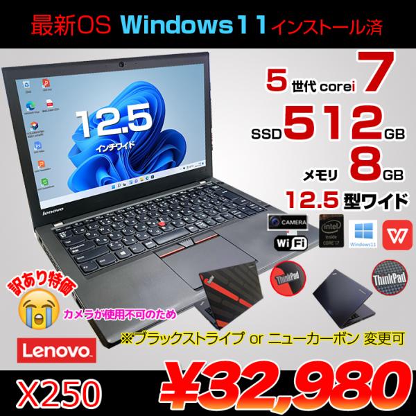 【中古パソコン Windows11搭載】Lenovo X250 中古 ノート 選べるカラー Office 第5世代 [Core i7 5600U 8GB SSD512GB 無線 指紋認証 12.5型 ] :訳あり(カメラ×)