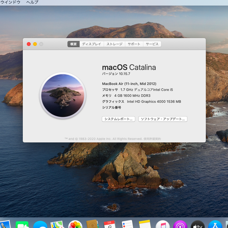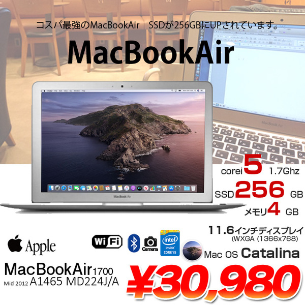 【中古パソコン】Apple Macbook Air 11.6inch MD224J/A A1465 Mid2012 [core i5 3317U 1.7GHz 4G SSD256GB 無線 BT カメラ 11.6インチ Catalina10.15.7] :良品
