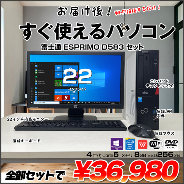 FMV-D583 すぐ使えるセット 中古 デスク Office Win10 第4世代 キー・マウス付[Core i5 4570 3.2GHz メモリ8GB SSD256GB ROM 22型液晶]:アウトレット