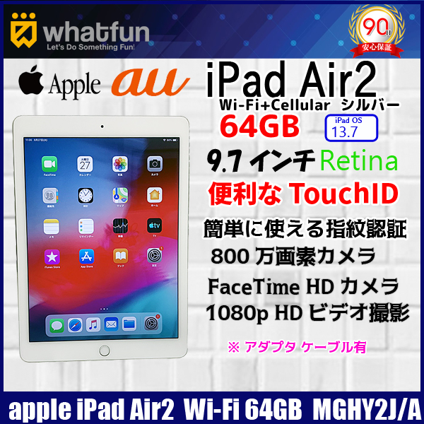【中古iPad】Apple iPad Air2 MGHY2J/A Retina au Wi-Fi+Cellular 64GB 指紋認証 [ A8X 64GB(SSD) 9.7インチ iPadOS 13.7 シルバー ] :良品