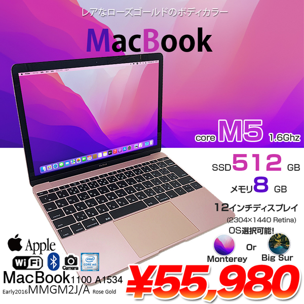 【中古パソコン】Apple Macbook 1100 MMGM2J/A A1534 Early 2016 選べるOS Monterey or Bigsur [coreM5 8GB SSD512GB 無線 BT カメラ 12インチ ローズゴールド ] :良品
