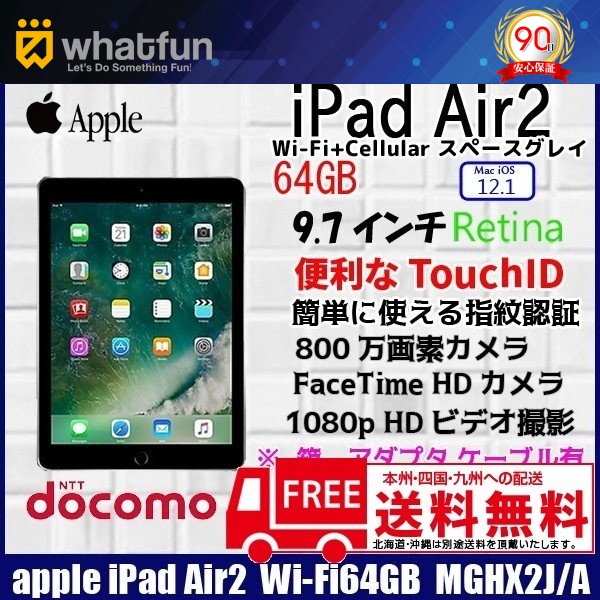 【中古iPad】Apple iPad Air2 MGHX2J/A Retina Docomo Wi-Fi+Cellular 64GB 指紋認証 [ A8X 64GB(SSD) 9.7インチ OS 12.1 スペースグレイ ] :良品 中古