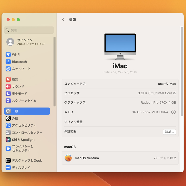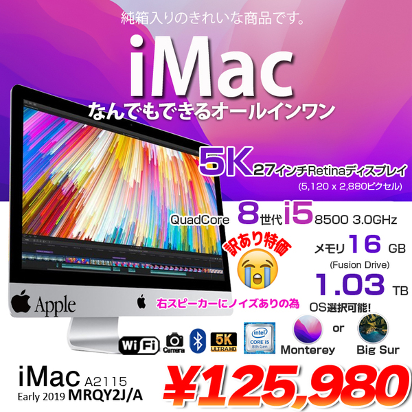 【中古パソコン】Apple iMac Early 2019 MRQY2J/A 8世代6コアCPU 5K 27インチ 選べるOS Monterey or Bigsur [Corei5 3.0GHz 16G Fusion Drive1TB BT 無線 ]:訳あり品