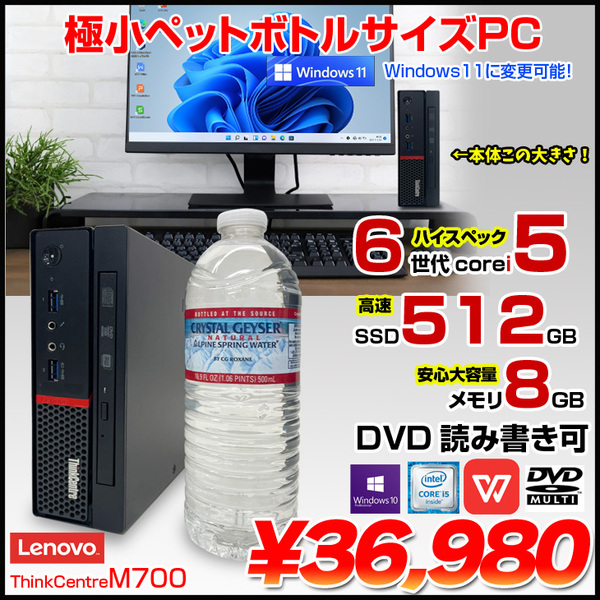 【中古パソコン】Lenovo ThinkCentre M700 多画面同時出力可 Office Win10 or Win11 第6世代 [Core i5 6400T 8G SSD512GB マルチ]:良品
