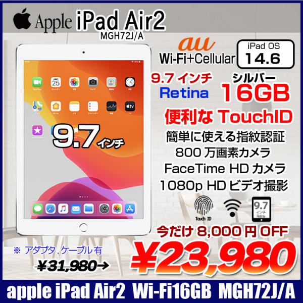 【中古iPad】Apple iPad Air2 MGH72J/A Retina au Wi-Fi+Cellular 16GB 指紋認証 [ A8X 16GB(SSD) 9.7インチ iPadOS 14.6 シルバー ] :良品 中古