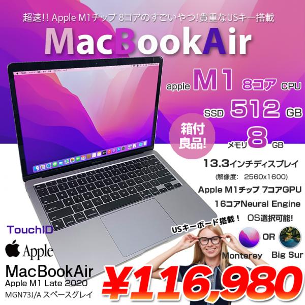 【中古パソコン】Apple MacBook Air 13.3inch MGN73J/A A2337 Late 2020 選べるOS USキー TouchID [Apple M1チップ8コア 8G 512GB 無線 BT カメラ 13.3 純箱 Space Gray] :良品