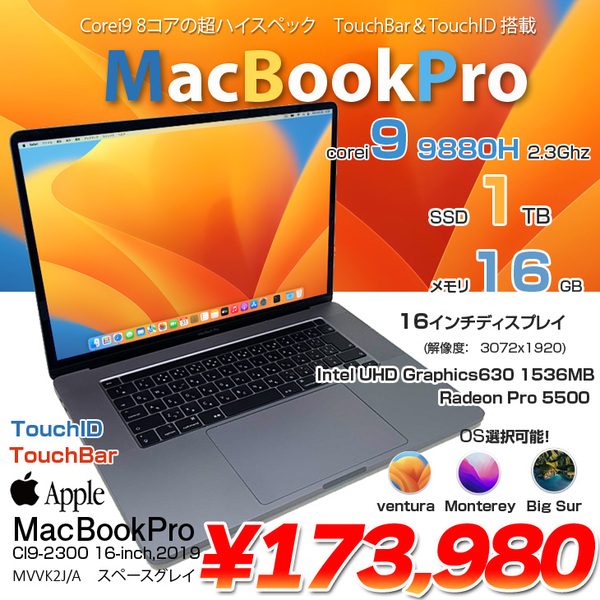 【中古パソコン】Apple MacBook Pro 16inch MVVK2J/A A2141 2019 選べるOS TouchBar TouchID [core i9 8コア 2.3GHz 16G SSD1TB 無線 BT カメラ 16インチ 純箱] :アウトレット