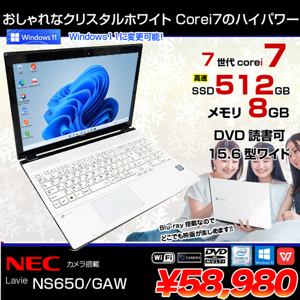 【中古パソコン】NEC LAVIE NS650/GAW 中古 ノート Office 選べる Win11 or Win10 home 第7世代 [Core i7 7500U 8GB 512GB マルチ テンキー カメラ 15.6型 ホワイト] :良品