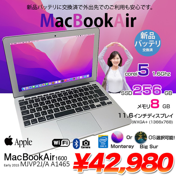 【新品バッテリに交換済】Apple MacBook Air 11.6inch MJVP2J/A A1465 Early 2015 選べるOS [core i5 5250U 8G SSD256GB 無線 BT カメラ 11.6] :アウトレット