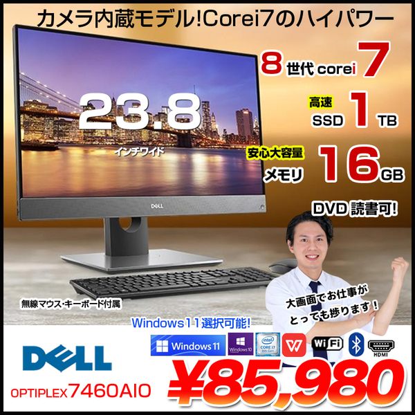 【中古パソコン】DELL OptiPlex 7460 AIO 中古 一体型デスク Office Win10 or Win11 キー・マウス[Core i7 8700 メモリ16GB SSD1TB マルチ カメラ 無線 23.8]:良品