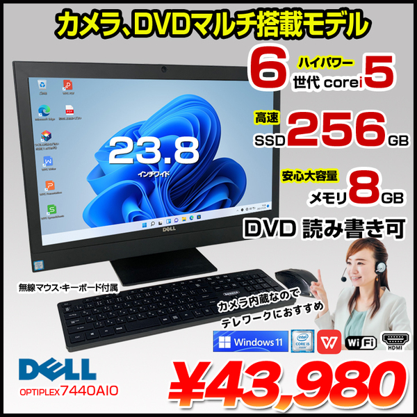 【中古パソコン】DELL OptiPlex 7440 AIO 中古 フルHD 一体型デスクトップパソコン Win11Home [Core i5 6500 3.2GHz 8GB SSD256GB マルチ カメラ 無線 23.8型 ]良品