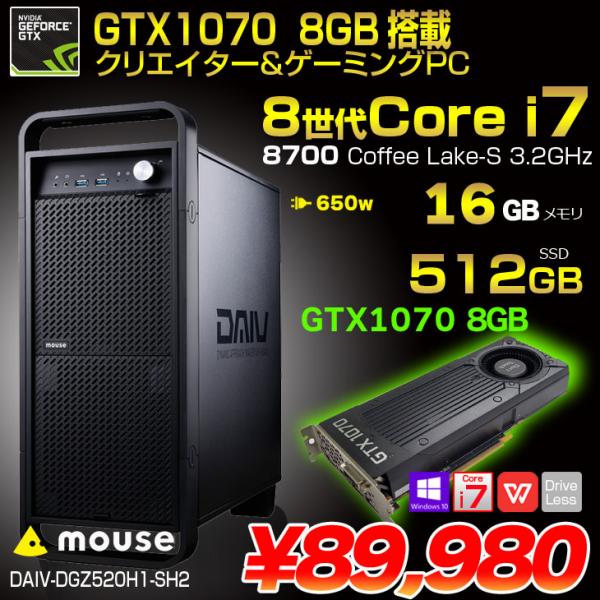 mouse DAIV-DGZ520H1-SH2 ゲーミングパソコン GTX1070 8GB 搭載 Win10 Office 第8世代[Core i7 8700 3.2GHz メモリ16GB 高速起動SSD512GB] :良品