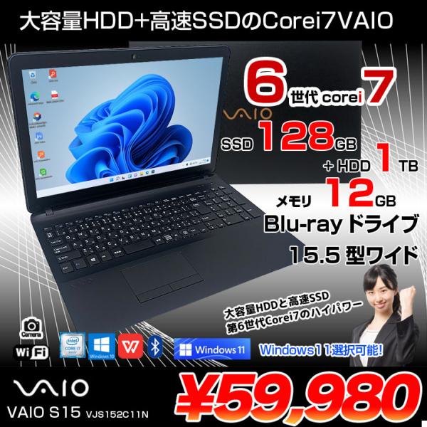 【中古パソコン】SONY VAIO S15 VJS151C11N 中古ノート Office Win10 or win11 カメラ テンキー [Corei7 6700HQ 12GB HDD1TB+SSD128G BD 無線 15.5型 純箱 Black] :良品