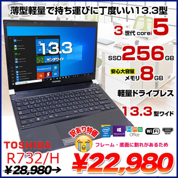 【中古パソコン】東芝 R732/H 中古 ノートパソコン Office Win10 第3世代 [core i5 3340M 2.7GHz 8GB SSD256GB 無線 13.3型 HDMI] :訳あり