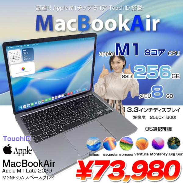 【中古パソコン】Apple MacBook Air 13.3inch MGN63J/A A2337 Late 2020 選べるOS TouchID [Apple M1チップ8コア 8GB SSD256GB 無線 BT カメラ 13.3 純箱 Space Gray] :良品
