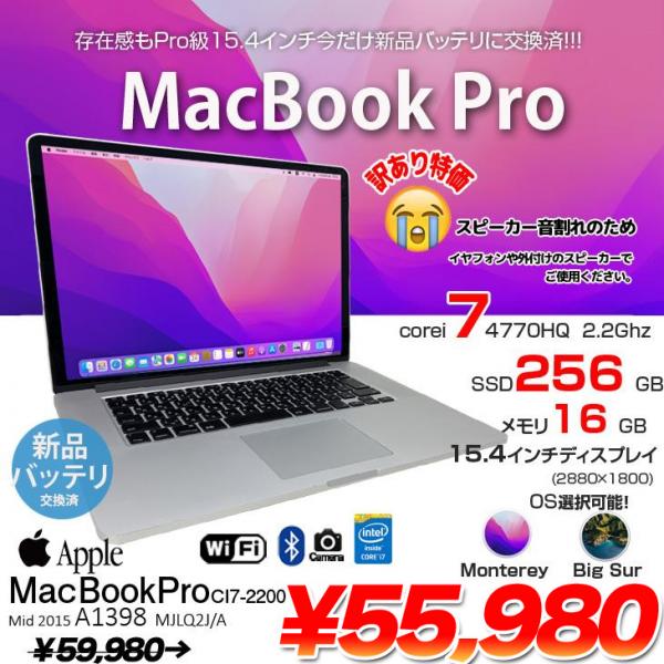 【新品バッテリに交換済】Apple MacBook Pro 15.4inch MJLQ2J/A A1398 Mid 2015 選べるOS [core i7 4770HQ 16G SSD256GB 無線 BT カメラ 15.4 ] :訳あり(スピーカー△)