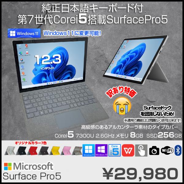 【中古パソコン】Microsoft Surface Pro5 中古 タブレット 選べるカラー Office Win11 or10 [Core i5 7300U 8GB 256GB 無線 カメラ 12.3型]:訳あり(ドック×)