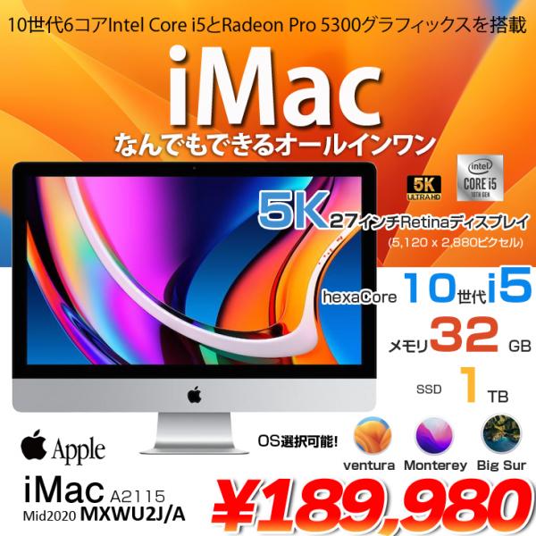 【中古パソコン】Apple iMac 27inch MXWU2J/A A2115 5K 2020 一体型 選べるOS [Core i5 10600 3.3GHz 32GB SSD1TB 無線 BT カメラ 27インチ ]:アウトレット