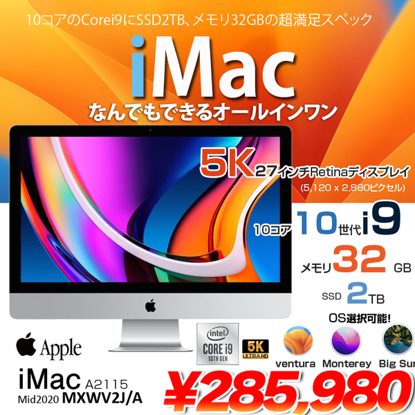 【中古パソコン】Apple iMac 27inch MXWV2J/A A2115 5K 2020 一体型 選べるOS [Core i9 10910 3.6GHz 32G SSD2TB 無線 BT カメラ 27インチ 純箱 ]:アウトレット