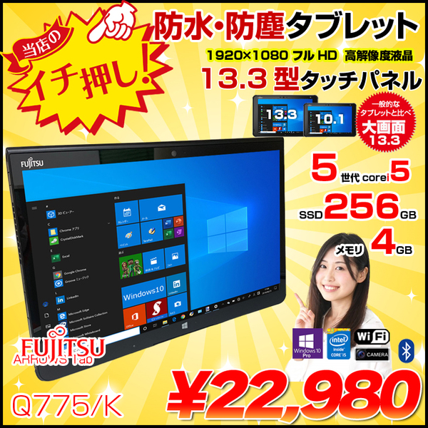 【中古パソコン】富士通 ARROWS Tab Q775/K 中古 タブレット Win10 防水 第5世代 [Core i5 5300U メモリ4GB SSD256GB 無線 カメラ 13.3型 スタイラス付 ] :良品