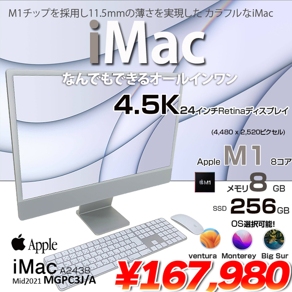 【中古パソコン】Apple iMac 24inch MGPC3J/A A2438 4.5K 2021 一体型 選べるOS Touch ID [Apple M1 8コア 8GB SSD256GB 無線 BT カメラ 24インチ Silver テンキー 純箱 ]:美品