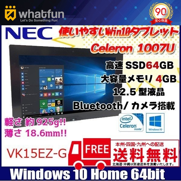 【中古パソコン】NEC VK15E/Z-G 中古 タブレット Win10 指紋認証 カメラ[ Celeron 1007U 1.5GHz メモリ4GB SSD64GB 無線 BT 12.5型] :中古