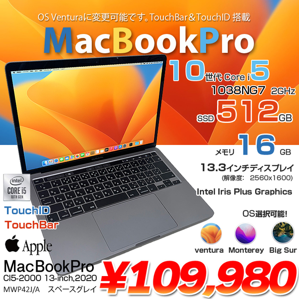 【中古パソコン】Apple MacBook Pro 13.3inch MWP42J/A A2251 2020 選べるOS TouchBar TouchID [core i5 1038NG7 2GHz 16GB SSD512GB 無線 BT カメラ 13インチ 純箱 ] :良品