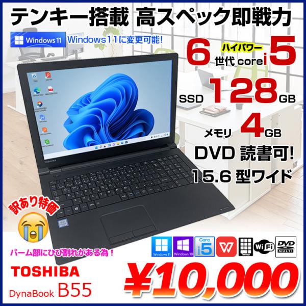 【中古パソコン】東芝 dynabook B55中古 ノート Office Win10 or Win11[Core i5 6200U メモリ4GB SSD128GB マルチ 無線 テンキー 15.6型] :訳あり