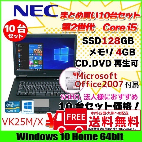 【中古パソコン】【10台セット】NEC VK25M 中古 ノート Microsoft Office2007 Win10 第2世代 [corei5 2520M 2.5GHz メモリ4G 新品SSD128GB DVD-ROM 15.6型 A4 ] :良品