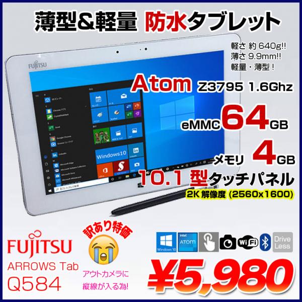 【中古パソコン】富士通 ARROWS Tab Q584 中古 タブレット Win10 防水 ペン付属 [Atom Z3795 メモリ4GB eMMC64GB 無線 10.1型] :訳あり(カメラ▲)