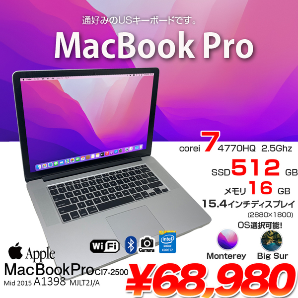【中古パソコン】Apple MacBook Pro 15.4inch MJLT2J/A A1398 Mid 2015 USキー 選べるOS Monterey or Bigsur [core i7 4870HQ 16G 512GB 無線 BT カメラ 15.4 ] :アウトレット