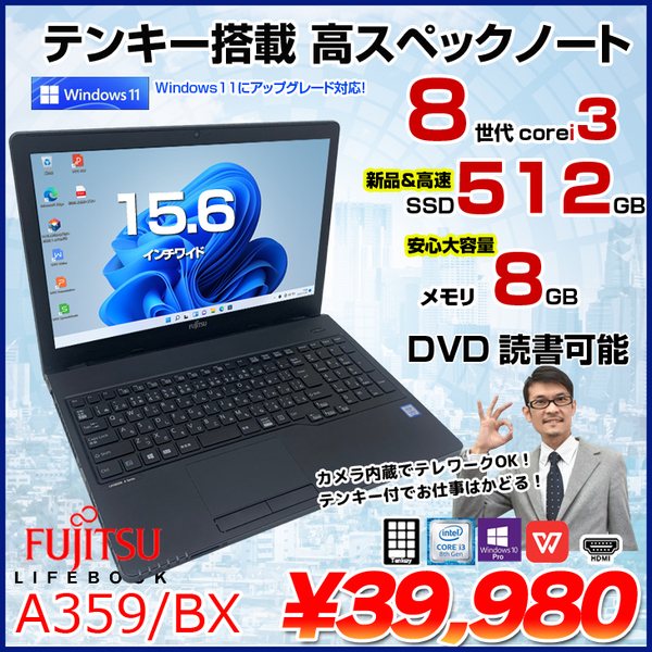 【中古パソコン】富士通 LIFEBOOK A359/BX 中古 ノートパソコン Office Win10 or Win11 第8世代 テンキー カメラ [Core i3 8130U 8GB SSD512GB マルチ BT 無線 15.6型 ] :良品