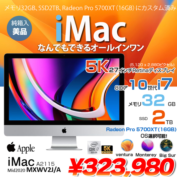 【中古パソコン】Apple iMac 27inch MXWV2J/A A2115 5K 2020 一体型 選べるOS [Core i7 10700K 3.8GHz メモリ32G SSD2TB RP5700XT 無線 BT カメラ 27インチ 純箱 ]:美品