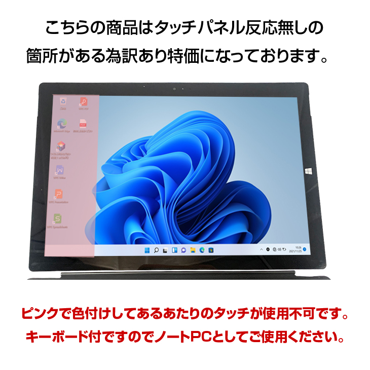 【中古パソコン】Microsoft Surface Pro3 中古 タブレット カラー Office Win11 or10 新品日本語キー [Core i7 4650U 8GB SSD256GB 無線 ] :訳あり(タッチ△)